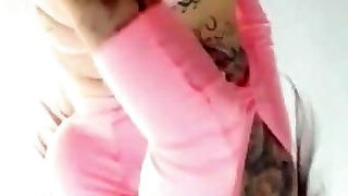 Tattooed woman with inborn tits pleasuring her hairy cunt